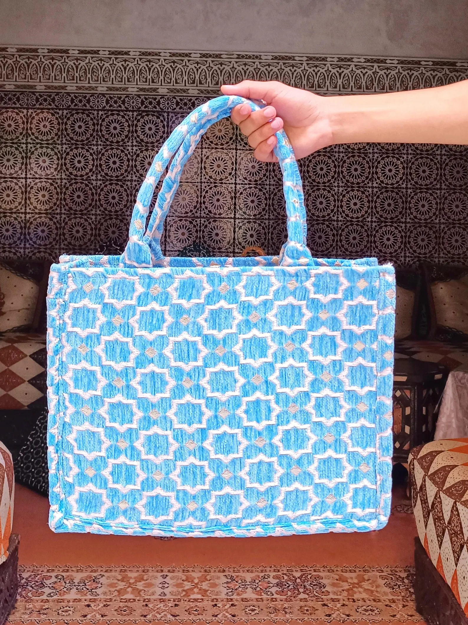 Discover the elegance of Morocco with this handmade tote bag, adorned with intricate zellij tile designs. This spacious and sturdy bag is crafted to carry all your essentials in style, perfect for the beach, market, or daily use.